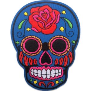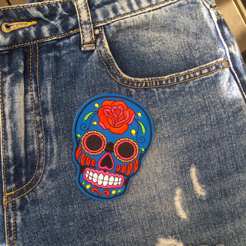 Geborduurde applicatie met daarop een blauwe sugar skull van 7,5 x 10 cm. Deze strijkapplicatie kan je gebruiken om kleine gaten mee te repareren. Bovendien kan je hiermee bijvoorbeeld een pet, tas, rugzak of trui een geheel nieuwe uitstraling geven. De patch kan worden opgestreken, en bij je aankoop ontvang je een opstrijkhandleiding.