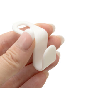 De haken zijn gemaakt van kunststof. De maat van een ophanghaak is 5,5 x 2 cm, en het gat heeft een diameter van 1 cm.