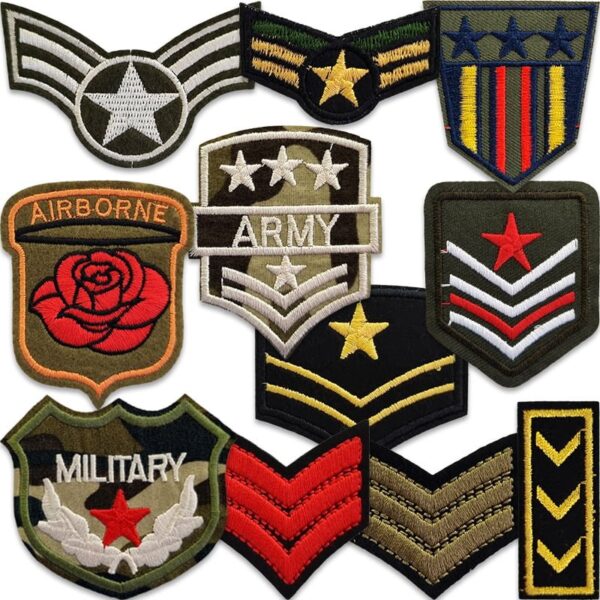 Een set van 11 populaire applicaties met militaire symbolen en rangorden. De maten lopen uiteen van 4 tot 7 cm. De applicaties kunnen op kleding of op andere stoffen worden gestreken.
