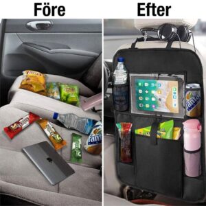 Deze organizer is voorzien van een groot transparant vak voor o.a. een tablet of iPad. Bovendien zijn er vier vakken om allerlei zaken gemakkelijk in op te bergen, van pennen tot drinkflessen. Onderaan deze autostoelorganizer is er ook een vak dat met klittenband kan worden geopend en gesloten.